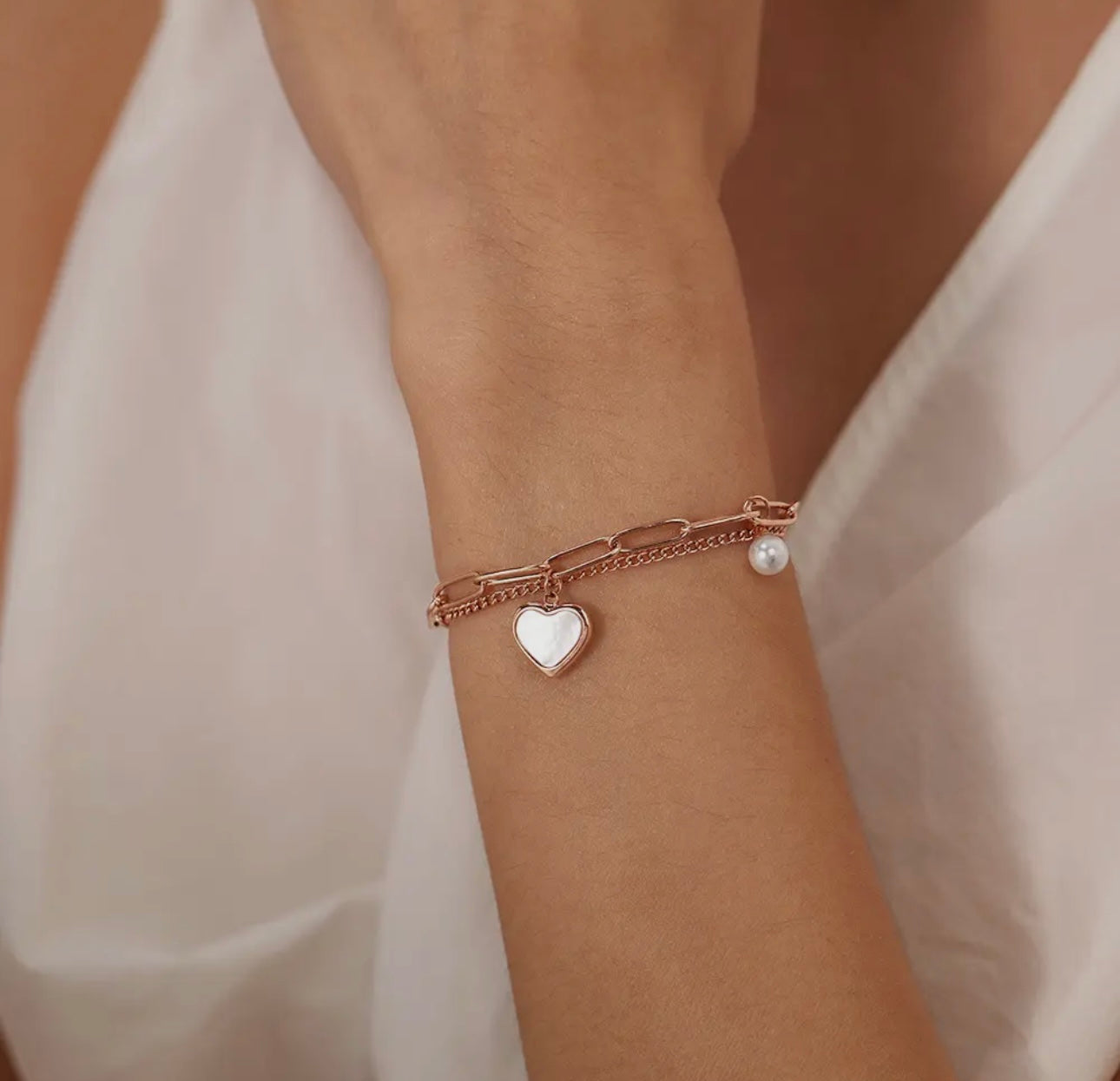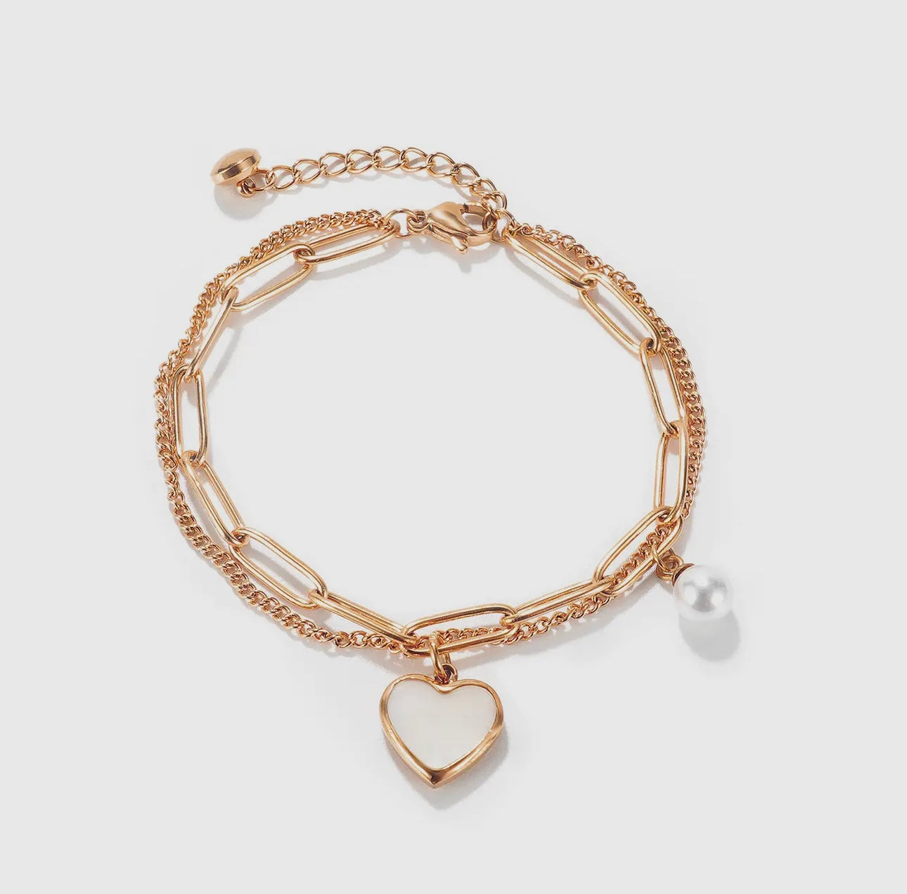 A Rose Gold modern classic, this chain bracelet radiates a sleek Pearls of the Peach Heart Pendants layered s design. A versatile chain bracelet that's perfect for any occasion, adding a touch of elegance and style to any outfit.